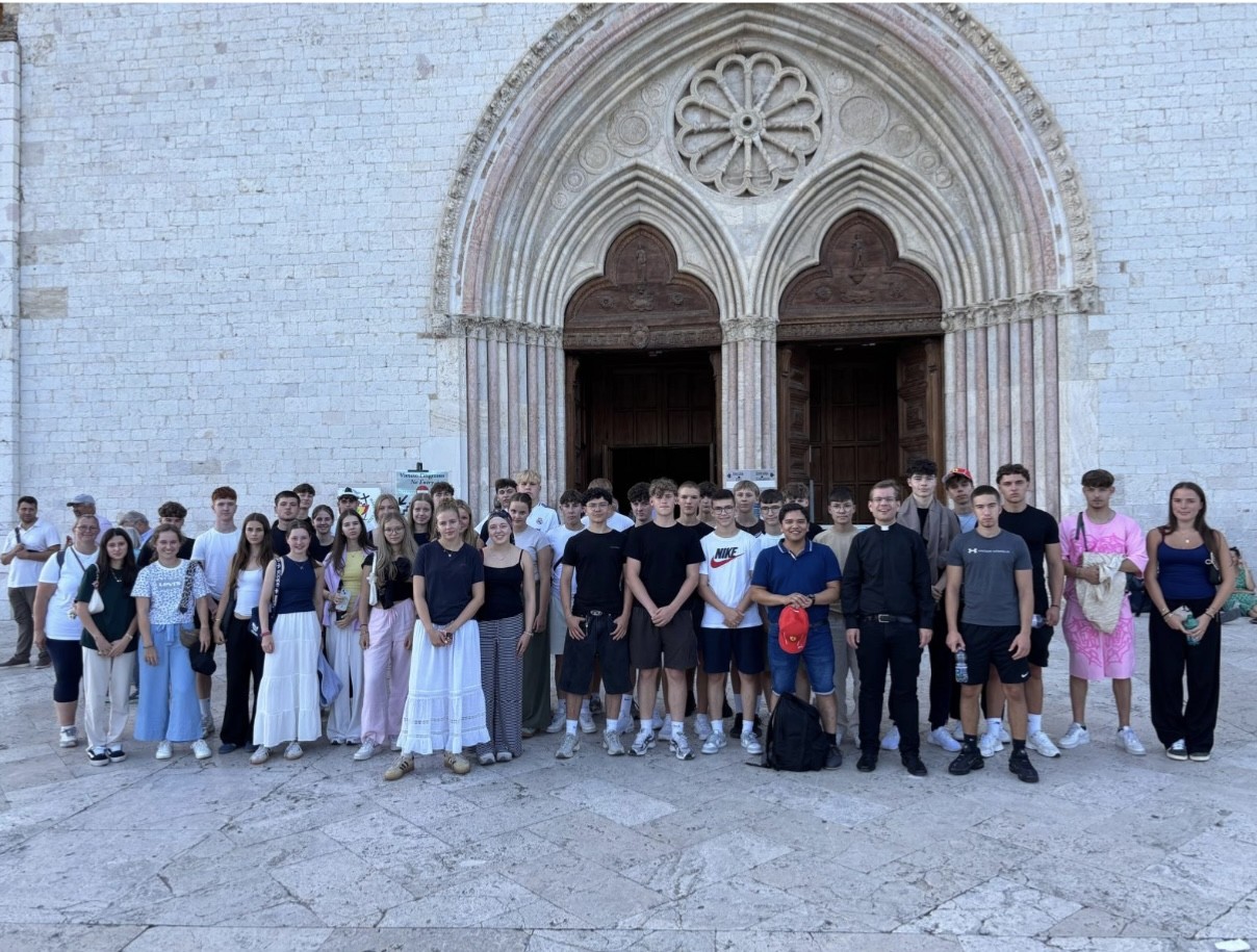 Nach einem guten Jahr des Wartens, war es dann so weit: Am Samstag, dem 6.9.25 waren alle Koffer und Taschen gepackt und wir begannen unsere Wallfahrt mit einer gemeinsamen Messe in der Hauskapelle der Franziskus Schule. Anschließend begannen wir, 47 Schüler der St. Franziskus Schule, mit unseren drei Lehrerinnen Frau Opitz, Frau Kubiak und Frau Alfes, sowie mit Pastor Albert, gegen 9.00 Uhr gespannt und voller Vorfreude die 24-stündige Busfahrt. Was nach einer langen Fahrt klingt, war zwar auch tatsächlich lang, aber durch Gesellschaftsspiele, gute Gespräche und eine allgemein gute Stimmung, die sich auch durch zwischenzeitliches gemeinsames Singen zeigte, verging die Zeit schnell.