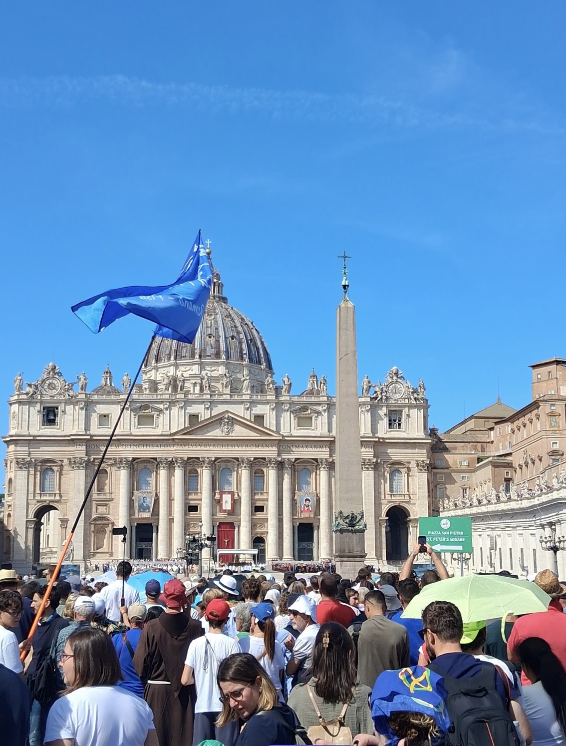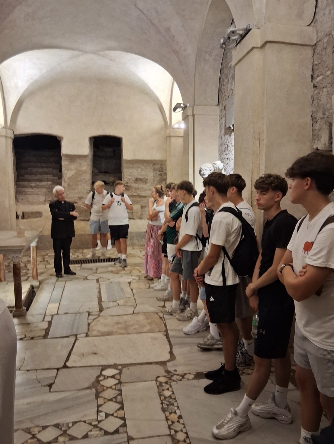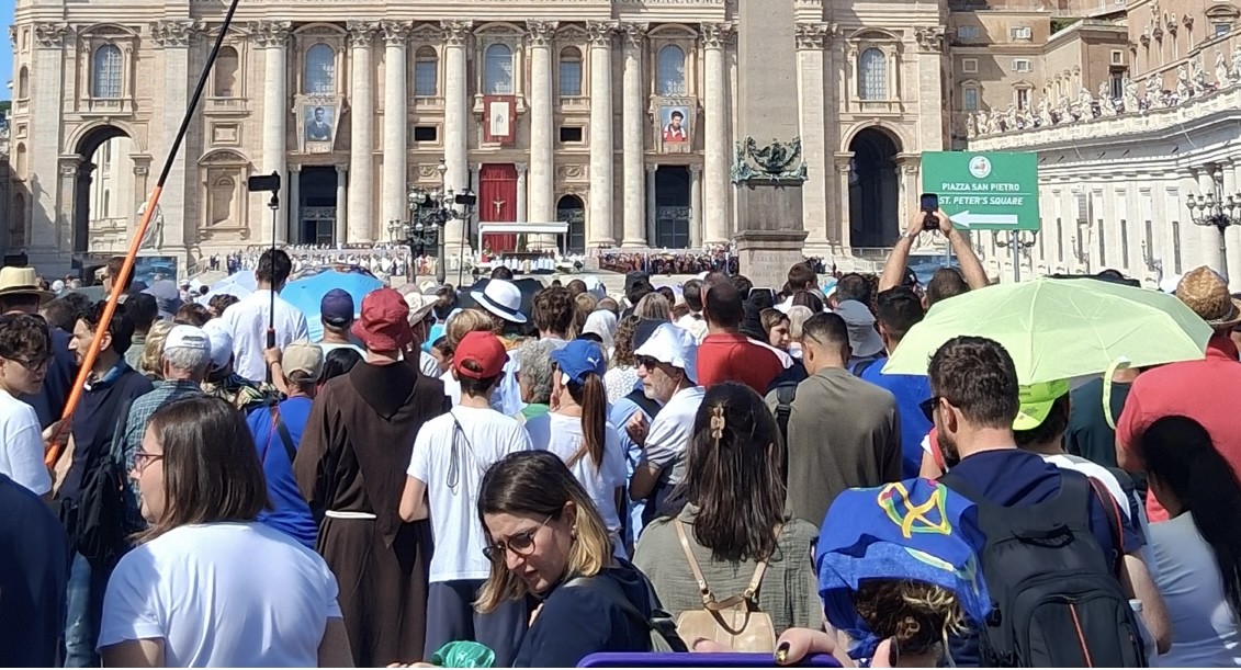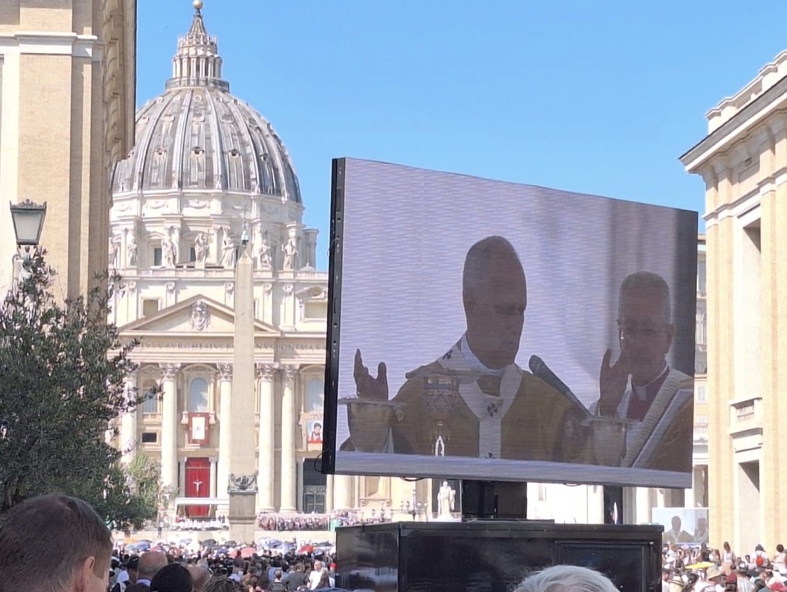 Morgens in Rom angekommen vergeudeten wir keine Zeit und brachten unsere Koffer zügig ins Hotel, um anschließend einen ersten Orientierungsspaziergang durch die Stadt zu machen und dann pünktlich gegen 12 Uhr zur Heiligsprechung von Carlo Acutis und Pier Giorgio Frassati am Petersplatz zu sein und dann mit dem Papst den Angelus zu beten. Viele waren erschlagen vom ersten Eindruck der Stadt. Und auch von der Hitze. An jeder Ecke gab es etwas zu sehen und etliche schöne Fotomotive. Um noch mehr davon zu sehen, bekamen wir am Nachmittag eine Stadtführung, in der uns die wichtigsten Orte des historischen Zentrums der Stadt gezeigt worden sind, die man mindestens einmal gesehen haben muss. So zum Beispiel antike Plätze, wie das Kolosseum, oder das Forum Romanum, wichtige Kirchen oder das Regierungsviertel. Zum Abschluss des ersten Programmtages feierten wir dann in Santa Maria Maggiore die Hl. Messe. Nach dem Abendessen hatten wir dann Freizeit, bevor wir dann alle froh waren, nach der anstrengenden Fahrt und dem ersten Tag, abends ins Bett zu fallen.