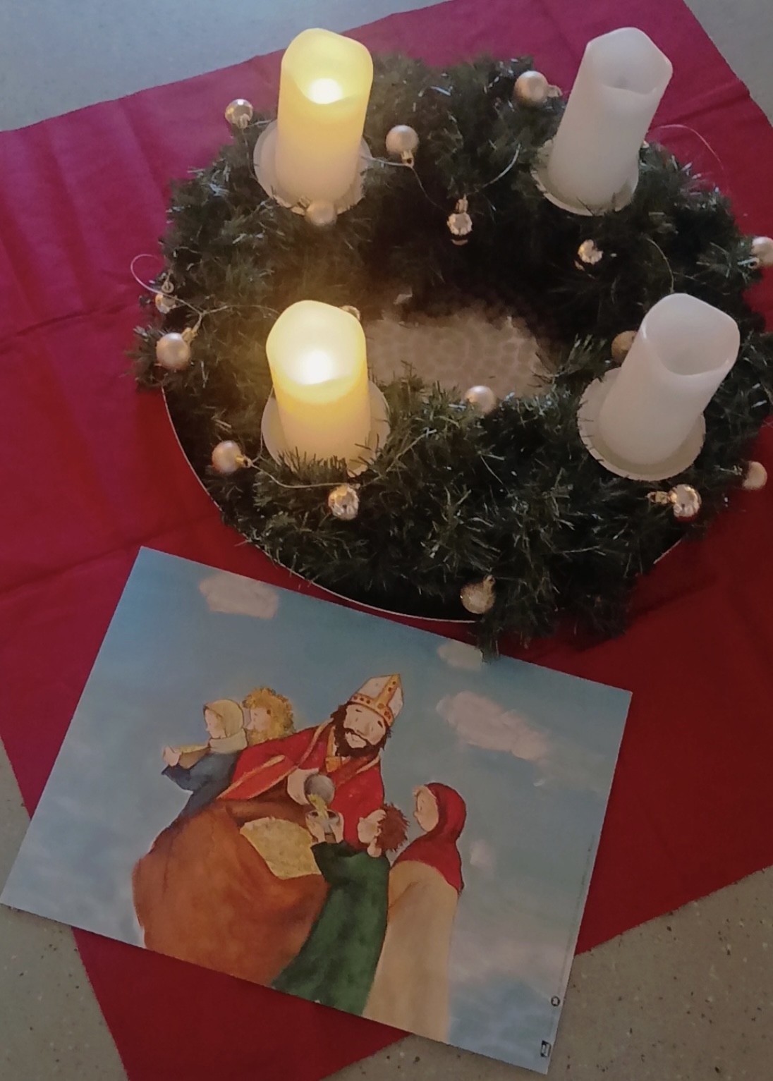 Wir haben unseren Adventskranz angezündet und dabei die ersten beiden Strophen „Wir sagen euch an den Lieben Advent“ gesungen. Danach hat uns Barbara mit dem Kamishibai die Legende vom Heiligen Nikolaus erzählt, dabei konnten alle die verschiedene Bilder bestaunen. Anschließend haben wir ganz gespannt den Adventskalender geöffnet. Denn es ist ja schon der 8. Dezember und Weihnachten rückt immer näher. Zum Abschluss der Andacht haben wir noch zu „Nikolaus und Nikoletta“ gesungen und getanzt.